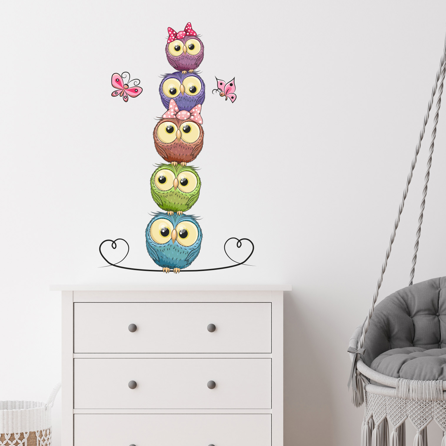 Questo adesivo da parete rappresenta una simpatica composizione di gufetti impilati, arricchita da farfalle decorative e dettagli a forma di cuore, ideale per creare un ambiente accogliente, allegro e stimolante.