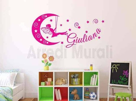 Una dolce fatina che gioca sulla luna, il suo nome e tante stelle che impreziosiranno la sua cameretta.