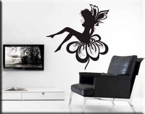 Adesivo da parete fata è una bellissima decorazione da muro floreale con la silhouette di una fata seduta su un fiore.