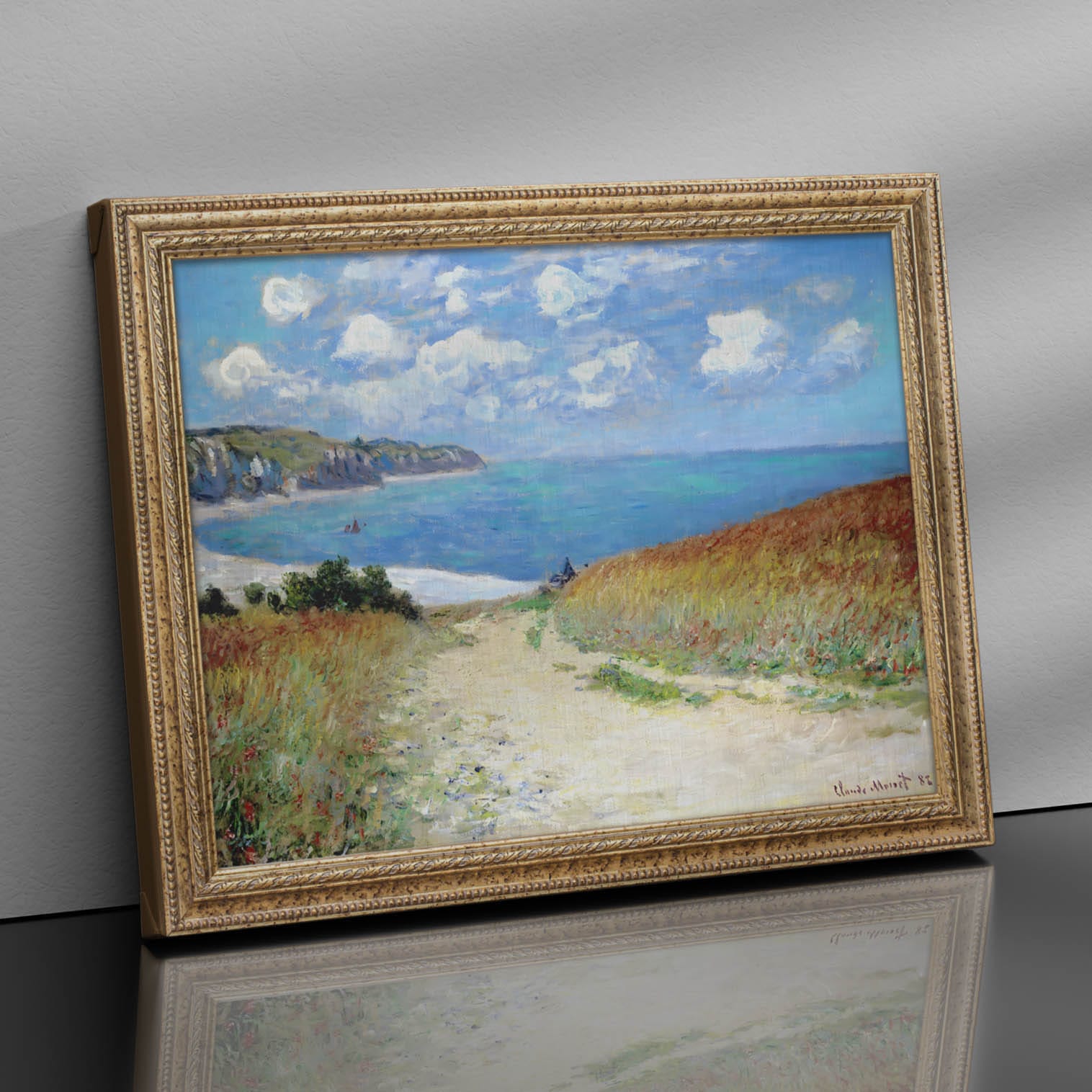 Questa versione moderna del celebre Cammino al mare tra campi di grano a Pourville, è realizzata con stampa su tela canvas di alta qualità e si distingue per un dettaglio unico: la cornice non è un elemento fisico applicato ma parte integrante dell’immagine stampata.