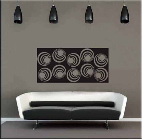 Un gruppo di cerchi intagliati in un unico pannello d’arredo con un fantastico effetto ornamentale di un dipinto su muro perché realizzati con vinile opaco intagliato e prespaziato senza nessuno sfondo trasparente.