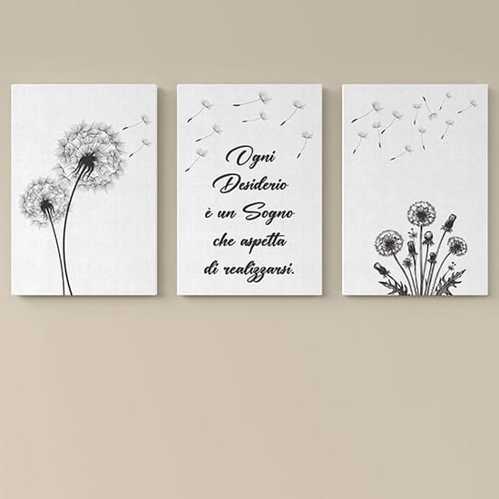 Questa frase stampata su tela si presta a diventare il fulcro di una composizione di tre quadri, conferendo un messaggio profondo e ispiratore.