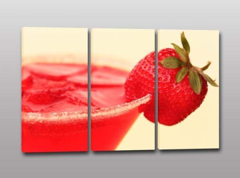 Quadri moderni bar cocktail fragola è un tris con stampa su tela di un bicchiere di cocktail alla fragola, una decorazione da muro che dona particolarità all’ambiente prescelto sia della casa che di un bar.