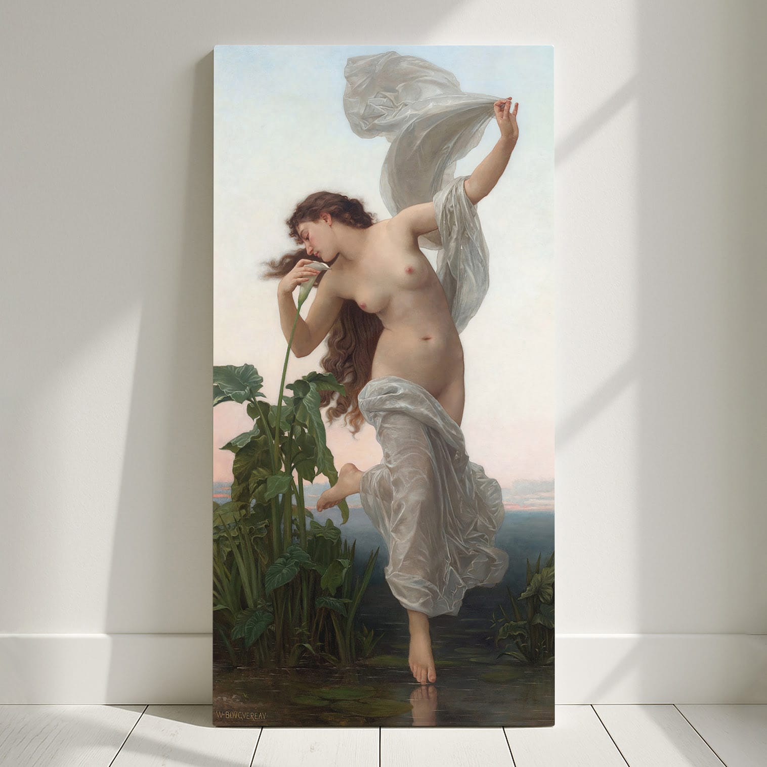 quadro donna nudo artistico classico Bouguereau su tela in ambiente moderno scuro