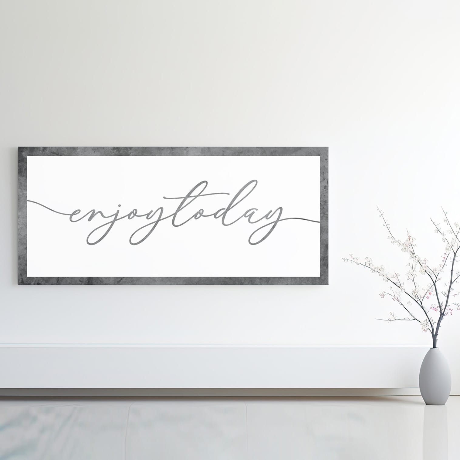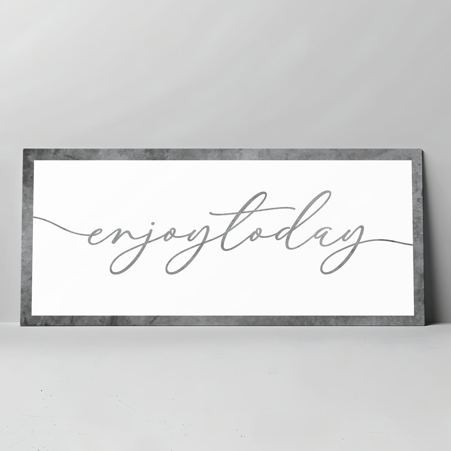 Il quadro presenta la frase “Enjoy Today” in una calligrafia raffinata su sfondo neutro, creando un contrasto visivo armonioso.