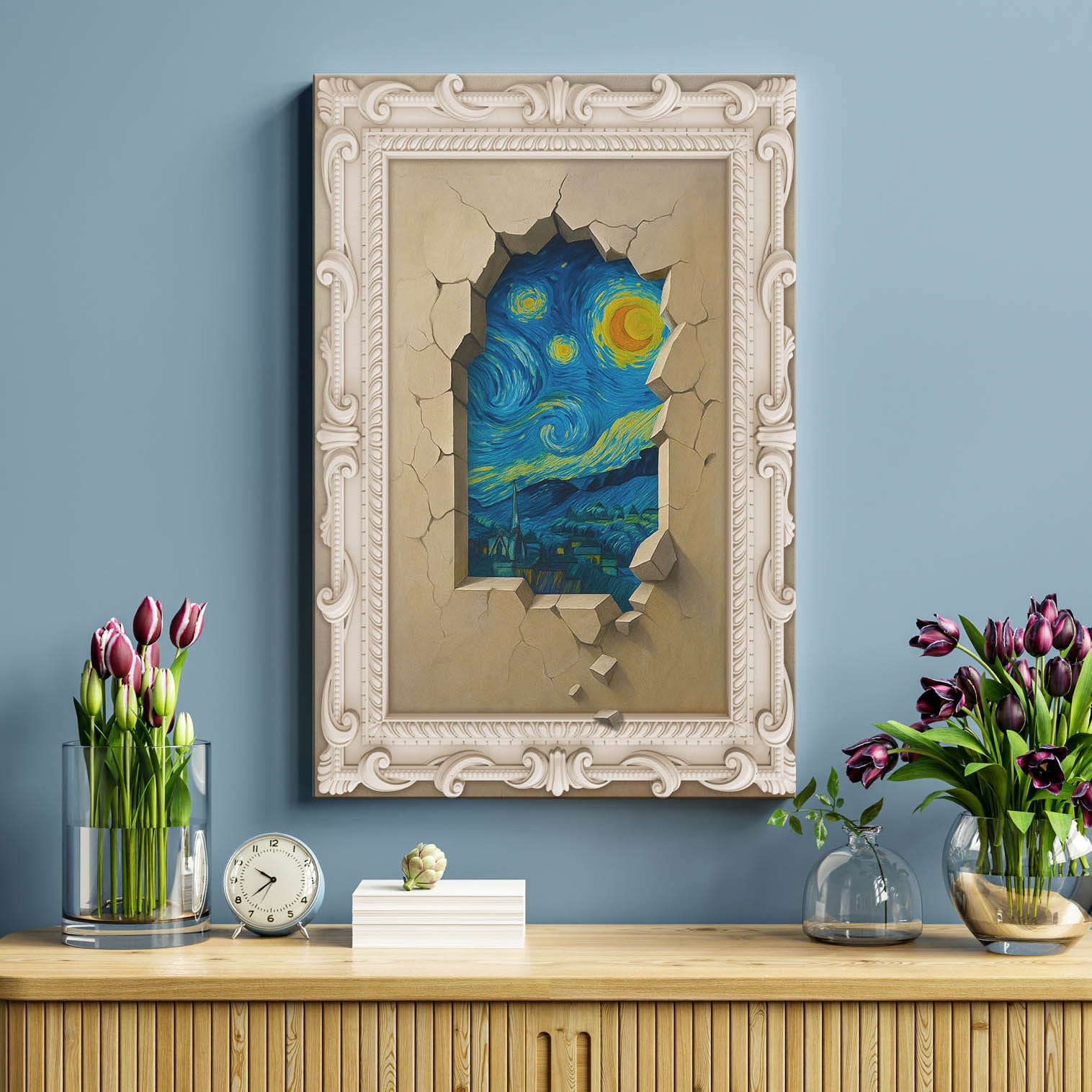 La composizione ripropone infatti un celebre scorcio ispirato a un classico dell’arte moderna – la “Notte stellata” – ed è ottenuta con una tecnica visiva che simula un effetto tridimensionale: la cornice diventa parte integrante dell’illusione, come se stesse spalancando uno squarcio nella parete.